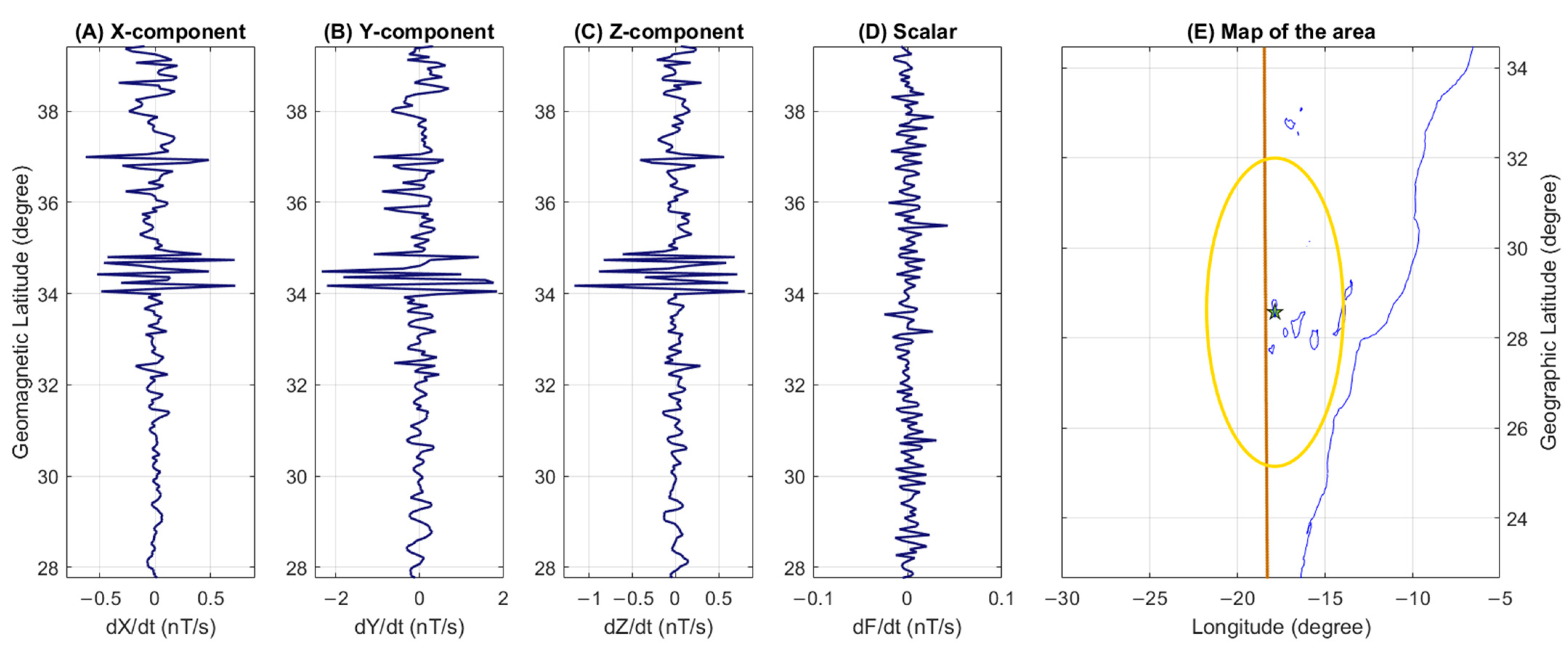 - Marchetti, D.; De Santis, A.; Campuzano, S.A.; Soldani, M.; Piscini, A.; Sabbagh, D.; Cianchini, G.; Perrone, L.; Orlando, M. Swarm Satellite Magnetic Field Data Analysis Prior to 2019 Mw = 7.1 Ridgecrest (California, USA) Earthquake. Geosciences 2020, 10, 502. [Google Scholar] [CrossRef]