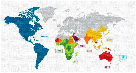 The fall armyworm (FAW), Spodoptera frugiperda, is native to the tropical and subtropical Americas, where it has been known for many decades as an economically detrimental pest of many crop species, especially maize. The FAW is a polyphagous lepidopteran pest widely considered to be one of the most damaging pests; it feeds on over 350 crops species to diverse families, including maize, rice, cabbage, soybean, tomato, cotton, etc. [6]. This pest has a strong preference for maize in the early vegetative stages when the plant presents tender green leaves [7]. Nevertheless, at the reproductive stage, the FAW tends to move to the cob, where it devastates yield quantity and quality [8]. This pest arrived in 2016 to Western Africa and spread quickly across Africa and has continued eastward through the Middle East by 2017, Asia by 2018–2019, and Australia by 2020 (Figure 1), and is expected to threaten Europe eventually [9,10]. The rapid spread of this species is related to its sporadic and long-distance migratory behavior, with the adult moths capable of flying over 100 km on a single night [11]. Some studies have indicated that the effect of FAW damage can cause USD 2.5-6.2 billon losses annually in yield maize across Africa [10,12]. In sub-Saharan Africa (SSA), this has been estimated to have increased by up to USD 13 billion per year after 2018 [13], thus threatening the livelihoods of millions of small farmers.