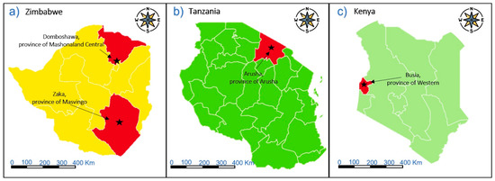 (a) Map of Zimbabwe, in red provinces of Mashonaland Central and Masvingo; (b) map of Tanzania, in the red province of Arusha; (c) map of Kenya, in the red Western province. Asterisks mark the locations where we took the data.