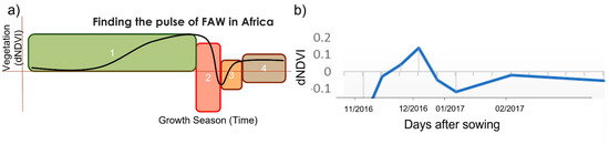 The left of Figure 4a is a graphical representation of the theoretical signal of the FAW in terms of vegetation change (Figure 4a); this is not the NDVI, but rather a derivative of the NDVI, (∆NDVI), where we anticipate opportunities to separate FAW impacts from a normal crop growth phenology. The rationale of the shape of this curve is that the FAW will decrease the crop leaf area during the vegetative growth stage, when it primarily eats the young leaves; however, the FAW will preferentially move to the cob once the crop enters the reproductive stage. In this moment, crop yield will be reduced but the crop leaf area may yet recover/regrow partially. The FAW has also been observed to infest a crop area and then quickly move on to another area, leaving the young crop, even still in a vegetative stage, to recover afterwards. Likewise, a similar recovery signal is observed in the case of a FAW infestation that is then treated afterwards. In Figure 4b, this part was based on the preliminary FAW data from known outbreak sites that were collected by the FAO FAMEWS app prior to our research initiation (https://www.fao.org/fall-armyworm/monitoring-tools/famews-mobile-app/, last accessed 25 June 2022).