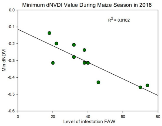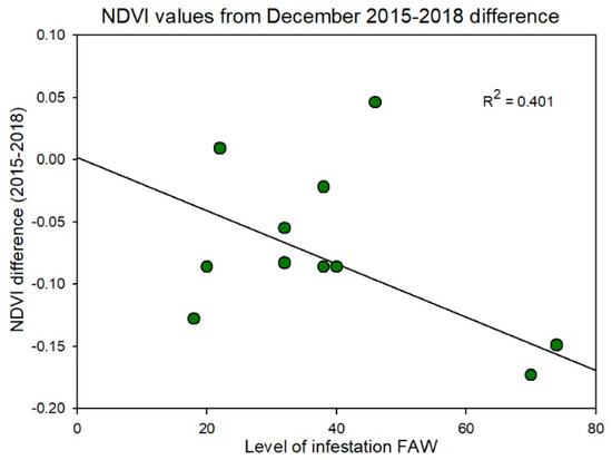 Figure 6 shows a comparison of the time series means of the NDVI values of December 2015, before the FAW, and the time series means of the NDVI values of December 2018 against the level of infestation with an R2 = 0.401. The values of the NDVI decrease as the level of infestation increases, following a logical negative correlation.