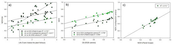 Coefficient of determination (R2) of the different indices of aboveground biomass against each other, all taken on the same day (28 May 2019). (a) In the x axis, the LAI is taken with the fisheye (from below the plant) and the y axis shows the NDVI calculated from PlanetScope (nanosatellite), the NDVI calculated from the multispectral sensor (at 5 m), and the GA index extracted from the RGB camera (at 5 m). (b) The GA index from the camera compared against the two different NDVI sources: the multispectral sensor and the nanosatellite. (c) The comparison between the NDVI from the nanosatellite and the NDVI from the field multispectral camera. (* = Pearson correlation significant with p < 0.05).