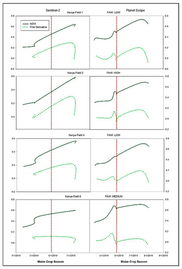 The PlanetScope curves in Figure 9 presented possible FAW-related anomalies in the values of NDVI, where the first derivative of NDVI values is negative. After these values start to increase again, indicating that the crop recovered its growth again, and that something caused a marked and sudden reduction in the total green biomass (NDVI), probably the timing and impact of a FAW pest invasion, notably because field measurements and surveys were conducted during those same days. In fact, field data were taken on 28 May 2019, indicated by the vertical red line in Figure 9.