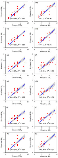 Correlations between the simulated and observed species richness of the plant community under fencing (a,c,e,g,i,k) and grazing (b,d,f,h,j,l) scenes, for random forest (a,b), generalized boosted regression (c,d), artificial neural network (e,f), multiple linear regression (g,h), support vector machines (i,j) and recursive regression trees (k,l). The solid lines indicate the linear fitted lines between the simulated and observed species richness. SRp: potential species richness; SRa: actual species richness. All the regressions were significant at p < 0.001.
