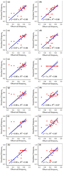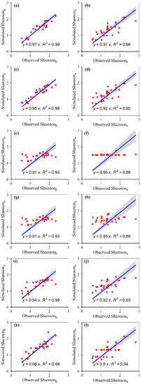 The simulated plant α-diversity was significantly and linearly correlated with the observed plant α-diversity (Figure 2, Figure 3, Figure 4 and Figure 5). The relative bias and RMSE values between the simulated plant α-diversity and observed plant α-diversity are shown in Table 2. The linear slopes, R2 values, relative bias and RMSE values between the simulated plant α-diversity and observed plant α-diversity varied among the six approaches, respectively (Figure 2, Figure 3, Figure 4 and Figure 5, Table 2). The linear slopes and R2 values between simulated plant α-diversity and observed plant α-diversity were no less than 0.88 (Table 2). The relative bias and RMSE values between simulated plant α-diversity and observed plant α-diversity were within a range from −6.53% to 9.14% and from 0.05 to 2.37, respectively (Figure 2, Figure 3, Figure 4 and Figure 5).