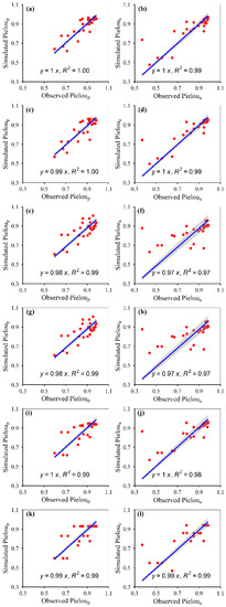 Correlations between the simulated and observed Pielou of the plant community under fencing (a,c,e,g,i,k) and grazing (b,d,f,h,j,l) scenes, for random forest (a,b), generalized boosted regression (c,d), artificial neural network (e,f), multiple linear regression (g,h), support vector machines (i,j) and recursive regression trees (k,l). The solid lines indicate the linear fitted lines between the simulated and observed Pielou. Pieloup: potential Pielou; Pieloua: actual Pielou. All the regressions were significant at p < 0.001.
