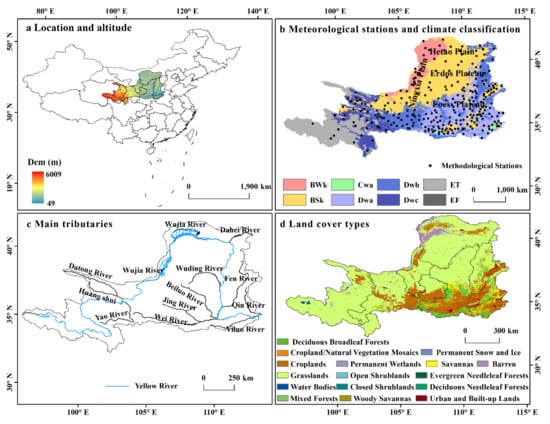 Figure 1. Location and altitude (a), stations and climate classification (BWk: cold desert; BSk: cold steppe climate; Cwa: dry-winter humid subtropical climate; Dwa: hot-summer continental climate; Dwb: warm-summer continental climate; Dwc: boreal climate; ET: tundra climate; EF: ice-cap climate) (b), main tributaries (c), and land cover types in 2019 (d) of the upper and middle reaches of the Yellow River Basin.