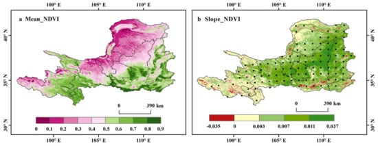 Figure 2. Spatial distribution of the mean NDVI (a) and inter-annual variation rate (slope) (b) during the growing season in the upper and middle reaches of the Yellow River basin from 2000 to 2019. Black dots indicate statistically significant correlations at the 95% confidence level. Same below.