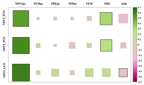 Figure 3. Partial correlation coefficients between 20-year seasonal NDVI time series and concurrent climate factors (temperature, TEM, precipitation, PRE, and sunshine duration, SSD), and climate factors (TEMps, PREps, and SSDps) and NDVI (NDVIps) of the preceding season. The color block size represents the element value size. Squares with black outlines show statistically significant correlations at the 95% confidence level.