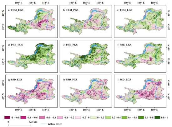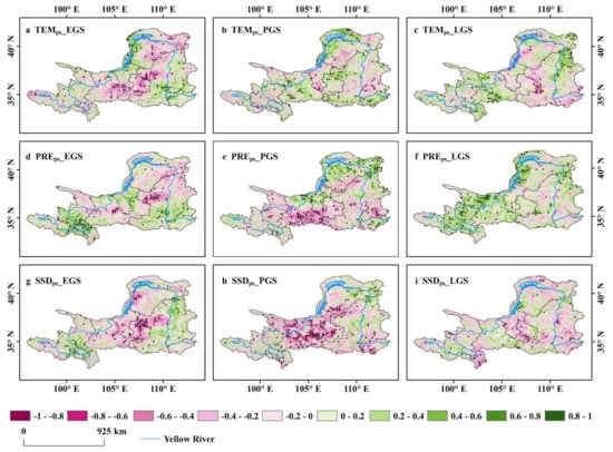 Figure 5. Spatial distribution of the partial correlations between NDVI of each season and the concurrent climate factors. Correlation patterns are shown for EGS (a,d,g), PGS (b,e,h), and LGS (c,f,i), and for correlation with concurrent TEM (ac), PRE (df), and SSD (gi).