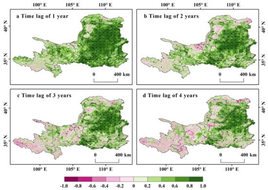 Figure 7. Spatial distribution of the partial correlations between NDVI of each year and that of the lag time, after controlling for the climate variable of both years.