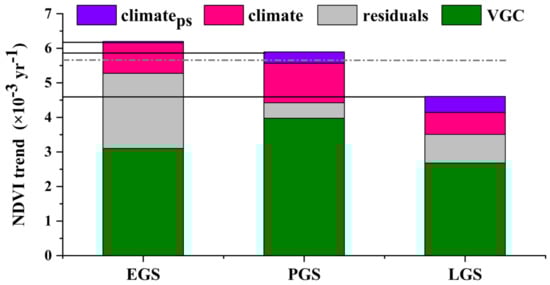 For each active season, we further quantified the individual contributions of the VGC effect, climate effects of the concurrent season, and climate effects of the preceding season on the 20-year vegetation growth (Figure 8). We combined the impacts of temperature, precipitation, and sunshine duration into the single variable of climate effects. The results showed that the greening trends in the three active growing seasons were predominantly attributed to the VGC (the contributions are 50%, 67%, and 58%, respectively) (Figure 8), confirming the positive carryover effect of vegetation seasonal growth. It is interesting to note that the VGC effect had the strongest correlation with NDVI during the LGS (Figure 3) but the VGC effect contributed the most to vegetation growth in PGS (Figure 8). We also found that PGS was the season whose inter-annual variation trend (slope) of vegetation growth was most similar to that of the growing-season mean (gray dashed line, Figure 8). Concurrent seasonal climate factors also played a positive role in the three active growing seasons of vegetation growth (the contributions are 14.24% (EGS), 19.38% (PGS), and 13.80% (LGS), Figure 8). In comparison, the climate of the preceding season played a much smaller role in the vegetation greening for the three active growing seasons (the contributions are 0.64% (EGS), 5.58% (PGS), and 10.03% (LGS), Figure 8). Residuals is the contributions of other driving factors, including human activities and natural disturbances, that could influence vegetation growth but were not analyzed in our research. However, the residuals had a positive impact on vegetation greening, especially in the EGS (Figure 8). From Figure 3, VGC- and humid-induced vegetation greening from the early growth season sustained to the late growing season (ignoring residuals), which was the primary factor dominating vegetation growth in the upper and middle reaches of the Yellow River in the 20 years period.