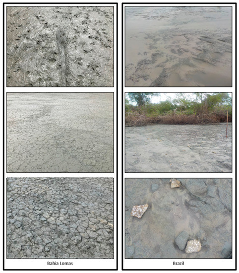 Pictures of typical mud sediment class found in Bahía Lomas (left) and Brazil (right). Both are typified by what appears to be smoother surface texture pocked by tracks or worm/crab holes. The cracked, dry, plated surface (lower left) was unique to Bahía Lomas.