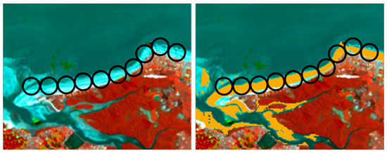 Circumferences of 250 m radii survey plots on the left, showing that using only the plot vectors would erroneously include pixels that were not intertidal habitat. The right shows the region categorized as “intertidal” in orange, using the methods outlined by Murray et al. The center of each survey plot was used as an independent field reference to validate the remotely sensed mapped outputs.