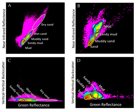 Spectral feature plots for the Brazilian and Bahía Lomas study sites with ellipses representing two standard deviations from the mean of each intertidal zone class. Plots (A) Brazil, (B) Bahía Lomas) depict the relationship between near-infrared and green surface reflectance from Landsat 8. Plots (C) Brazil, (D) Bahía Lomas depict the relationship between the vertical–vertical backscatter from the Sentinel-1 SAR platform and the green Landsat 8 surface reflectance values. Note that dry sand (i.e., sand from beaches and dunes outside the normal intertidal zone) was included for comparison in the Brazil study site plots but was not used to represent the spectral endmember for sand.