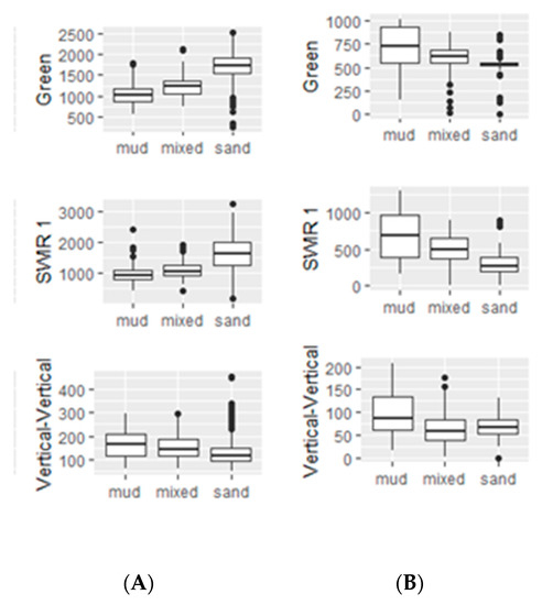 These and other studies of multispectral remote sensing of the intertidal zone have noted the low spectral reflectance of mud in the visible and near-infrared spectrum relative to sand, typically caused by higher interstitial water content and organic matter retention in the finer grain-sized muds that increases absorption of the visible and near infrared wavelengths [37,38]. Using a bidirectional spectral reflectance model and laboratory-measured multi-angular spectra of soil samples obtained from tidal flats, Gao et al. [38] were able to model how the soil moisture content (interstitial water content) affected the photometric properties. The amount of residual surface water content can also be a complicating factor. Employing IKONOS imagery, Choi et al. [39] observed the opposite relationships of higher reflectance with the finer sediment grain size that they attributed to scarce remnant surface water on the mud flats in their study site. The timing of image acquisition in relation to the time since the last flooding tide, and thereby the amount of drying time, can also come into play. For example, Rainey et al. [40] reported that sand can show a lower reflectance than mud when intertidal sediments are completely saturated, suggesting that images collected after the longest time of intertidal exposure provide the best basis for differentiating sediment grain size by minimized interstitial and surface moisture.