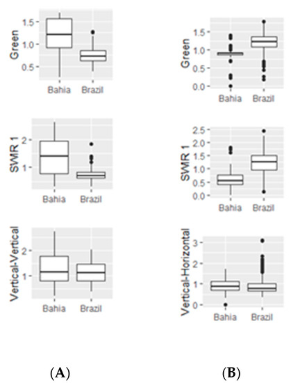 The reflectance of mud (Figure 7A) and sand (Figure 7B) classes for all Landsat 8 bands were significantly different between Brazil and Bahía Lomas (Table 1). This was not the case with Sentinel-1 backscatter data, with sand vertical–vertical not being significantly different between locations (Table 1), and mud not being significantly different for both vertical–vertical and vertical–horizontal.