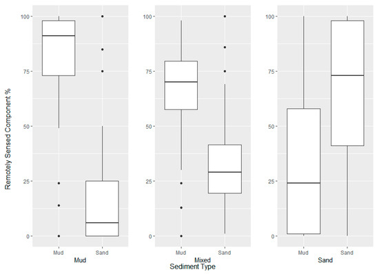 Box plots of predicted % sand vs. mud from unmixing analysis for mud, mixed, and sand field reference plots for Bahía Lomas study area.