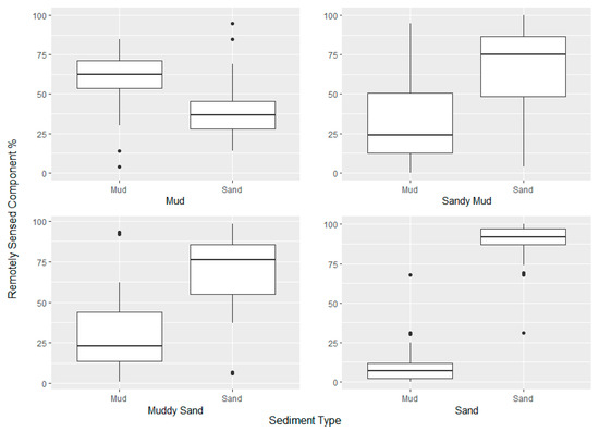 Box plots of predicted % sand vs. mud from unmixing analysis for mud, mixed, and sand field reference plots for northern Brazil study area.