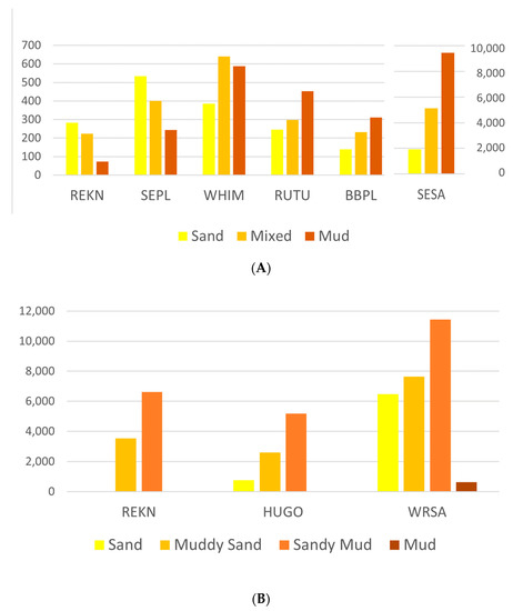 Examination of the results of the field surveys conducted in Brazil (2016) and Chile (2018) shows the variation in habitat usage by the dominant species of migratory shorebirds (Figure 10A,B). At the Brazil study site, sanderlings (SAND), red knots (REKN), and semipalmated plovers (SEPL) were observed feeding with the highest frequency in sand-dominated habitats. The whimbrel (WHIM) was more of a generalist, while ruddy turnstones (RUTU), black-bellied plovers (BBPL), and semipalmated sandpipers were observed feeding more frequently on mud-dominated habitat. At the Chile study site, red knots (REKN) were observed most frequently feeding on the mixed sand–mud flats while the white-rumped sandpiper (WRSA), and to a lesser extent the Hudsonian godwit (HUGO), was observed feeding on the sand-dominated and mixed flats. The WRSA was the only one of the three species observed feeding in the mud-dominated areas.