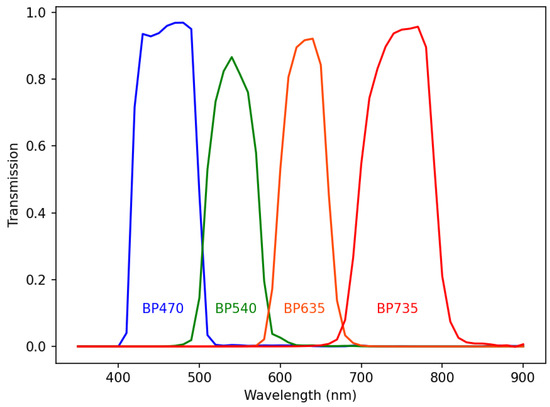 Transmission curves of the filters selected for VIS/NIR imaging. The filter bands were chosen to enable discrimination between the fire spectrum shown in Figure 1 and artificial light sources.