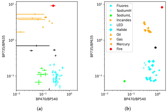 (a) Scatter plot of band ratios from measurements for light sources selected in Figure 3. The fire is denoted as a red circle and is well separated from the other light sources. The symbol colors indicate approximate grouping of the sources on the diagram. The same colors are used in Figure 3 for the dotted circles that enclose the corresponding light sources. Black is used for sources not assigned to a group. Note that both axes use logarithmic scales. (b) Band ratios using spectra of artificial light sources from [20]. The symbol shapes indicate the light source type from [20] as indicated in the legend. The red circle is the band ratio calculated from the fire spectrum in Figure 1. The fire is well separated from the artificial light sources.