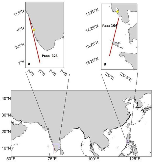 According to the available of tide gauge measurement data and the HY-2B altimeter orbit data, two areas are selected as study areas: the 0–40 km offshore area in the southwest of the Indian Peninsula (area A) and the 0–40 km offshore area in the southwest of the Philippine Islands (area B), as shown in Figure 2.