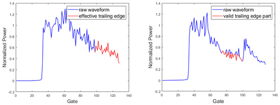 Usually, coastal ‘contamination’ initially appears in the annulus measurement footprint, and the circular measurement footprint survives. However, when the satellite nadir is close to the shoreline, the annulus measurement footprint covers more pure sea surface, while the circular measurement footprint entirely covers the coastal ‘pollution’, which means that the distortion of the waveform is located around the leading edge. More steady and effective information on the trailing edge is retained within a certain range offshore. Therefore, an effective trailing edge search method is proposed. The effective part of the trailing edge is identified by the power slope between each gate and the fixed gate to reduce the influence of waveform distortion on waveform retracking. For determining the width of distorted waveform, Peng [21] gives some suggestions to avoid influencing the precision of fitting, however, to retrieve the coastal data as possible, this article takes a more radical way and the choice of effective trailing edge reaching parameters are empirical values based on the statistics of real HY-2B altimeter waveform. The details of the effective trailing edge are shown in Figure 8.