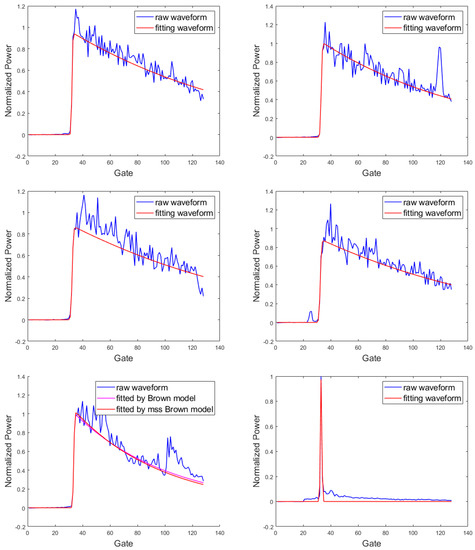 Compared with subwaveform retracking, total-waveform fitting is steadier and needs to carefully address the distortion of the waveform trailing edge. For the coastal ‘contamination’, strong reflections on the coastal sea surface leave a hyperbolic trajectory through waveform space, and there is a geometric relationship between the reflections and sample gates of the waveform [17,18], which gives the physical possibility to position the distorted part of coastal waveform. Simply comparing along-track echograms from different satellite data of the same spatial-temporal area, some objects called ‘bright targets’ on the sea surface can be estimated using geometric analysis [19]. Furthermore, according to the relative location of coastal ‘pollution’ in relation to the satellite nadir, the corresponding waveform noise is removed from the along-track echograms, and along-track waveforms with clean trailing edges are obtained [20]. When the distortions of the waveform are irregular and fragmentary, the waveform distortion parts can be detected directly by the shape characteristic. Multiple Brown-peak (MBP) waveform retracking uses adaptive peak detection (APD) to recognize the peak noise of the Brown-peak waveform and processes the distorted trailing edge of a single waveform efficiently [21,22].