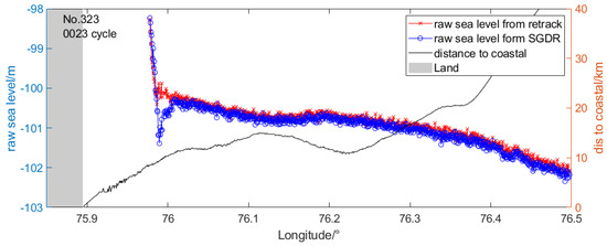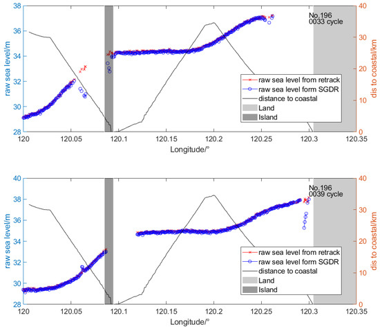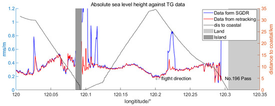 Figure 13 shows the RSL comparisons of the reprocessing results and the SGDR data in the pass 196. Since the trajectory of the pass 196 is almost perpendicular to the shoreline, the satellite altimetry is slightly affected by the coastal land in theory. Hence, the RSL values of the reprocessing results and SGDR data are almost the same beyond 10 km offshore. Within 10 km offshore, a small amount of the RSL of the SGDR data deviates and has been corrected in the reprocessing results, especially in the range from 5 km to the island.