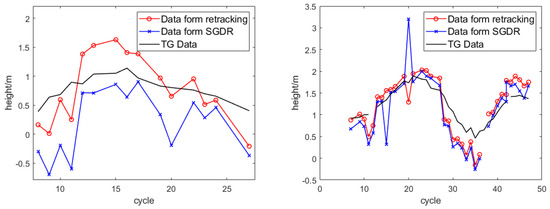 From Figure 14, we can see that the changing of tide gauge observation and altimetry data are roughly same, and that the local trend is different due to the tide gauge does not completely fall into the trajectory of satellite. As stated in Section 4, the sea surface height of reprocessed data is higher than the SGDR data, and reprocessed data possesses more similar changes with the tide gauge data. In the comparison result of pass 323, the changing trend of cycle 13–17 of reprocessed data has better consistency with the tide gauge data than the SGDR data. Additionally, in the comparison result of pass 196, the SGDR data has more outliers, such as the value of cycle 15 and cycle 20, and the changing trend of cycle 40–50 of reprocessed data is more stable and coherent against tide gauge data.