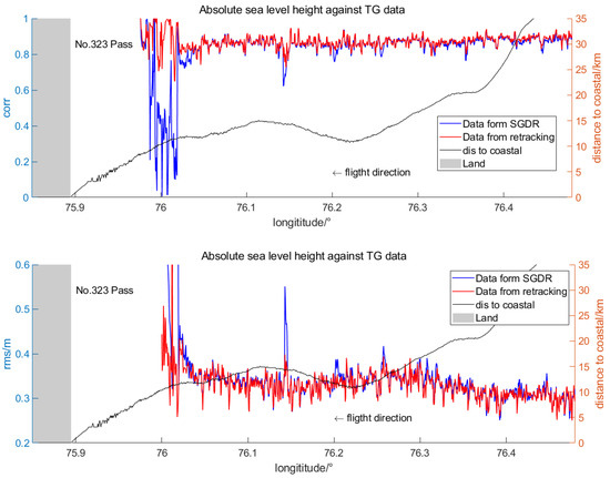 Then, based on the comparison method mentioned by Fenoglio [36], the different periods of the pass 323 and pass 196 data are linearly interpolated into the reference track, which consists of the normal points (NPs). Depending on the ASSH time series, the correlation coefficient and the root mean square (RMS) of reprocessing results and SGDR data against tide gauge data are calculated at each NP. The calculation results are shown in Figure 15 and Figure 16.