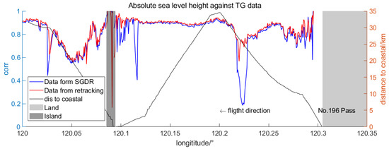 The RSL comparisons between the reprocessing results and SGDR data of pass 196 (x-axis is the along-track latitude, the left y-axis is the RSL and the right y-axis is the distance from the nominal points of the track to the shoreline illustrated by the black line, the blue line is the SGDR data and red line is the reprocessing results. The light shadow area represents the land and deep shadow area represents the coastal island, the direction of flight is from 120.35° to 120°).