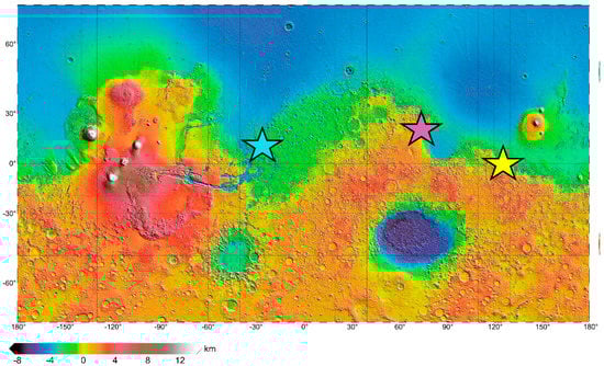 Area selection. Colorized terrain base image from the Mars Orbiter Laser Altimeter (MOLA). Investigated areas: cyan asterisk = Oxia Planum; purple asterisk = Nili Fossae, yellow asterisk = Gale Crater. Image source from https://www.planetary.org/space-images/mars-orbiter-laser-altimeter (accessed on 17 July 2022).