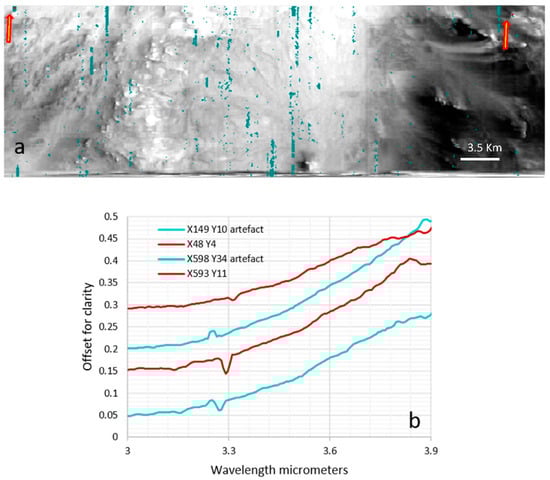 Examples of investigated artifacts. (a) One band in grayscale of CRISM I/F observation frs0002a9b2, center latitude/center longitude 20.9575°, 75.4673°, in the Nili Fossae area. The image has an x-axis corresponding to the width of the slit and a y-axis that corresponds to the along-track direction. The map of 3.3 μm absorption was superimposed on this image (sea green color); (b) examples of two spectra corresponding to two pixels in the sea green color clusters, showing the artifact absorptions in the 3.2 μm to 3.5 μm range; in dark red are shown two possible true absorptions, related to two pixels in the clusters, indicated by the two arrows in the image.