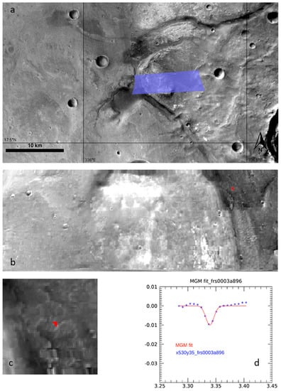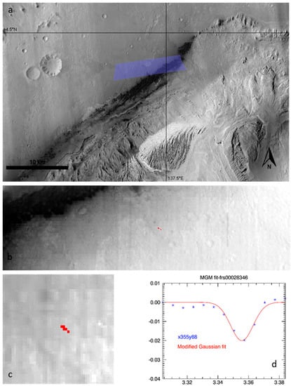 Finally, CO2 ice also shows a strong absorption at 3.3 μm []. The phase diagram of CO2 for Mars has shown that, at average temperatures of approximately −50 °C at average latitudes and pressure of approximately 6 millibar, CO2 should be present in gaseous form []. Therefore, we considered CRISM data acquired at mid-latitudes, where CO2 should occur in gaseous form.