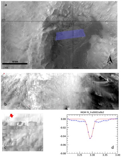 Cluster in frs0003a896 (about 5000 m2). (a) frs0003a896 CRISM stamp overlapped on MRO Context Camera (CTX) global mosaic; (b) not georeferenced frs0003a896 image with a red cluster featured by spectral absorptions at 3.34 μm; (c) zoom of the cluster; (d) spectrum with the highest absorption in the cluster (blue asterisks) and fitting with MGM curve to extract spectral parameters.