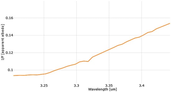 For absorption bands of approximately 3.3 μm, another chain of processing was created. Each whole CRISM I/F cube was processed through a procedure that first removed spectral spikes and resulted in a hyperspectral cube with a range of I/F values between 0.0 and 0.3. The spikes occurred on single spectral channels and not in the same channel for different pixels. We considered spike values as I/F higher than 1. The values were corrected by substituting them with the median value of the neighboring pixels. After this step, a de-striping process was applied, according to the procedure described in []. This last type of processing was followed by another procedure that searched for the 3.3 μm absorption, in the portion of spectrum between 3.2 and 3.4 μm, for each pixel in the scene. As we were considering a narrow range, the continuum was removed by subtracting a linear function passing through the reflectance values of the first and last points in the range.