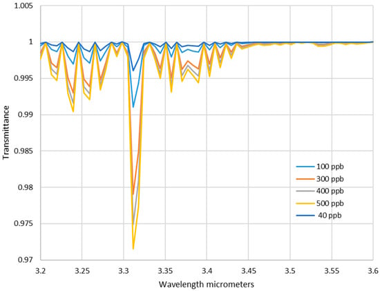 Simulated transmittance spectra in the 3.2 μm to 3.6 μm range of the frs0003a896 image in Oxia Planum, with increasing concentration of CH4 from 40 ppbv to 500 ppbv.