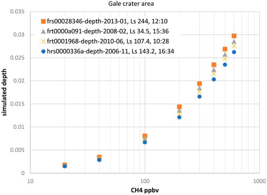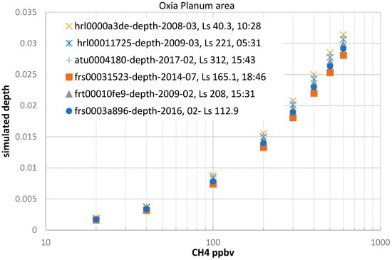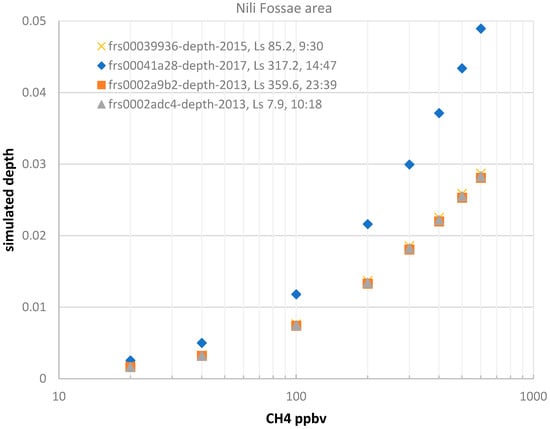 As previously mentioned, each CRISM observation of this study was collected during a different year, season, and time (Table 2). However, the three plots of the increasing simulated CH4 band absorption vs. the depth in the simulated spectra showed a general agreement among the depths, independently from the season and year of observation. Therefore, in general, we concluded that the depths of the absorption band at 3.3 μm of methane corresponded to approximately 0.008 for 100 ppbv, for all the sites. One exception was for the observation frs00041a28, where the concentration of 100 ppbv corresponded to a deeper value of absorption (depth = 0.012).