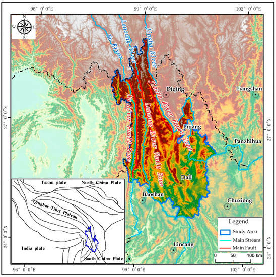 The Three Parallel Rivers Region (TPRR) is located in the Hengduan Mountains region in the northwest of Yunnan Province, China, and it is the intersection of the three geographic regions of the Qinghai–Tibet Plateau, East Asia, and South Asia [1]. The Jinsha River, Nujiang River, and Lancang River are three well-known rivers in Asia, flowing in parallel from north to south in this area, forming three deep canyons.