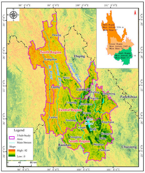 The northern region is a typical alpine and canyon landform. According to DEM calculations, the average elevation of this region is 3140 m, the average terrain slope is 27°, and the total area is about 25,100 km2. The central region is a typical middle-alpine landform, the elevation is 2470 m above sea level, the average terrain slope is 21°, and the total area is about 23,900 km2. The southern region is a typical low-mountain hilly landform with an average elevation of 2080 m and an average terrain slope of 17°, and the area is about 16,800 km2.