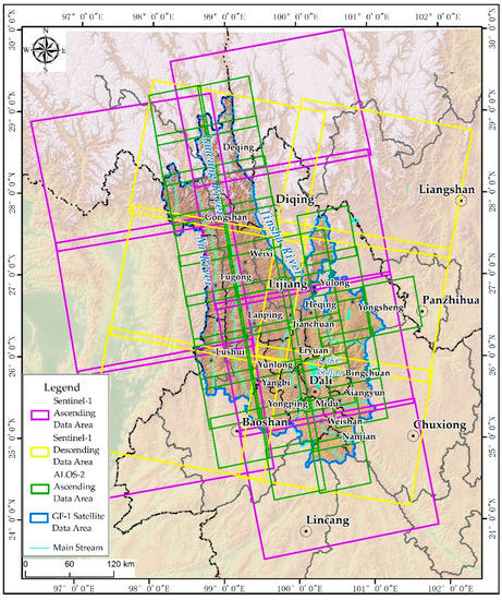 At present, many scholars have carried out InSAR identification and monitoring of landslide geohazards in the TPRR. For example, Zhao et al. used ALOS/PALSAR-1 to identify potential landslides in the Wudongde reservoir area of the Jinsha River [23]; Liu et al. integrated Sentinel-1 and ALOS/PALSAR-2 SAR datasets to create a survey map of active landslides in the Jinsha River basin [24]; Wang et al. created a landslide inventory map in the lower Niulan River, a tributary of the Jinsha River, based on Sentinel-1 and ALOS/PALSAR SAR datasets [25]; Cao et al. compared the identification effectivity of potential landslides in the lower Jinsha River from Sentinel-1 data and ALOS-2 data [26]. The above studies are mostly concentrated in the Jinsha River Basin, where hydropower development is more intensive, and the identification and investigation of landslides have not been widely carried out in the Lancang River Basin and the Nu River Basin. In addition, when only using InSAR technology to carry out landslide identification and investigation, the high density of vegetation in mountainous areas and the excessive terrain height difference often lead to the failure of InSAR technology in some areas.