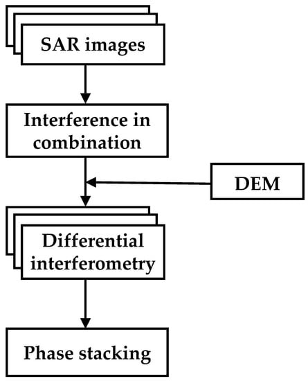Stacking-InSAR technology is based on D-InSAR and obtains the surface deformation rate result by performing a weighted average solution on multiple differential interferograms [33]. The data processing flow of Stacking-InSAR is shown in Figure 4. The premise of Stacking technology processing is to assume that the surface deformation trend is linear deformation. The phase stacking can effectively suppress atmospheric phase and DEM errors, and improve the relative accuracy of deformation information. The advantage of this technology is that by processing a relatively small amount of SAR data, it can quickly obtain the distribution of landslide geohazards in a large area, and the reliability of the results is relatively high [21,22].