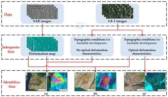 Flowchart of active landslide identification ((a) active landslide with abnormal surface deformation and no obvious optical deformation characteristics; (b) active landslide with abnormal surface deformation and obvious optical deformation characteristics; (c) active landslide with obvious optical deformation characteristics without abnormal surface deformation).