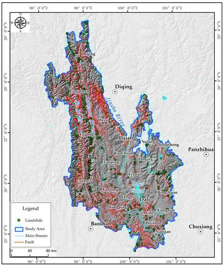 Active fault zones have an important impact on the distribution of geohazards such as landslides [36]. There are many active fault zones in the TPRR on the southeastern margin of the Qinghai–Tibet Plateau.