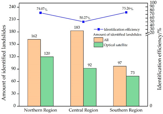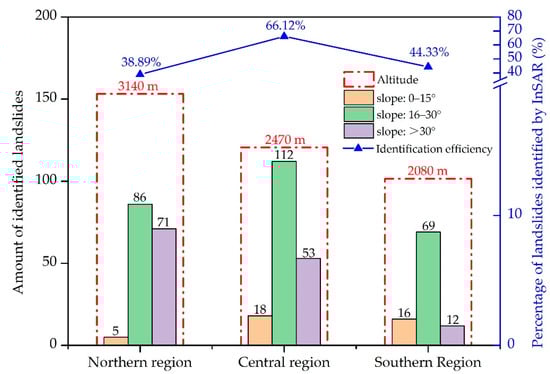 From the northern region to the southern region, the overall altitude of the mountain and the slope of the active landslide show a downward trend. However, the identification efficiency of the active landslides based on InSAR technology increases first and then decreases. In the central area, the identification efficiency of active landslides based on InSAR technology is highest.