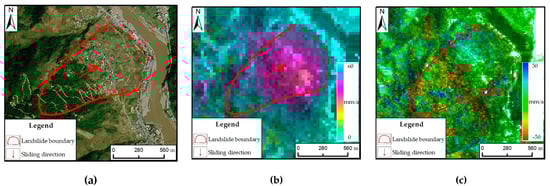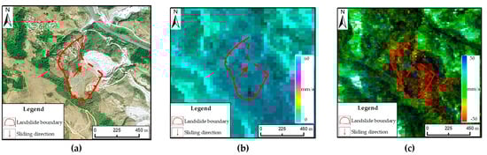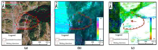 LSHP012 landslide ((a) optical satellite image; (b) InSAR deformation map of Sentinel-1A data; (c) InSAR deformation map of ALOS-2 data).
