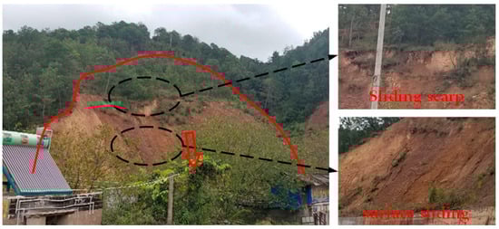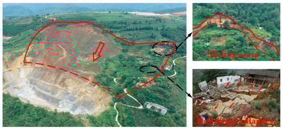 According to the on-site investigation of the landslide, the front edge of the landslide is an open-pit mining area (at the time of writing, the mining activities have stopped). Due to the large-scale excavation of the front edge of the slope in the early stage, the deformation of the landslide was caused. On the left trailing edge of the landslide, a newly descended steep ridge with a height of approximately 5 m can be seen, and the cracks on the surface of the slope are densely distributed, causing some houses to collapse (Figure 16). This landslide belongs to the active landslides induced by mining, and the landslide deformation is relatively strong. The identification result based on the ALOS-2 data is correct. Due to the small scale of the landslide and the dense vegetation on the left side of the slope, the Sentinel-1A data, with low resolution and weak vegetation penetration, cannot identify the YPHP008 landslide.