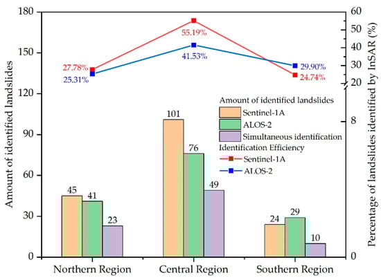The statistical results are shown in Figure 12 from the northern region to the southern region; the overall trends of ηInSAR-S and ηInSAR-A are essentially the same as those of ηInSAR, showing a trend of first increasing and then decreasing. ηInSAR-S and ηInSAR-A in the central region are higher than those in the northern and southern regions, respectively. In addition, the ηInSAR-S of both the northern and central regions is higher than the ηInSAR-A of the respective regions, indicating that, in the northern and central regions, more active landslides were identified based on Sentinel-1 data than those identified based on ALOS-2 data.